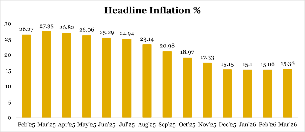 Headline inflation rose by 0.32% to 15.38% year-on-year (February: 15.06%), broadly in line with our forecast of 15.39%. While the increase in the annual index remains moderate, largely reflecting favourable base effects, the underlying momentum is more evident in monthly trends. Month-on-month inflation surged to 4.18% from 2.01%, pointing to a sharp re-acceleration in current price pressures.